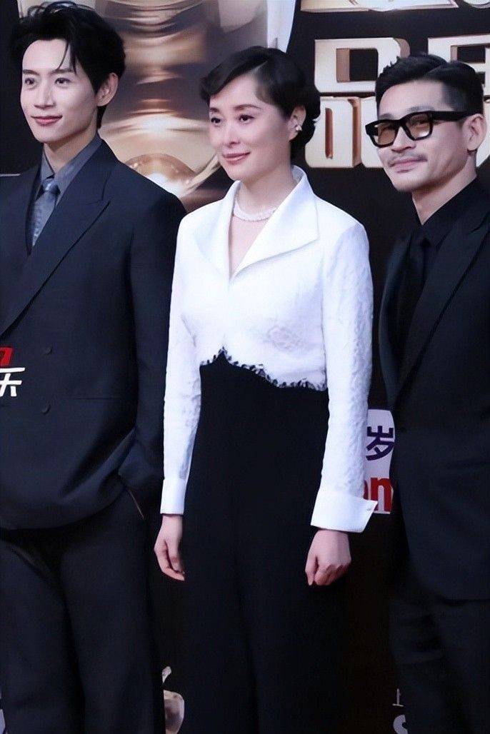 在满目浓艳的红毯中,她宛如一泓清泉——上身是细腻柔美的白色蕾丝衬衫,下装则选配挺括黑色西装裤,整套造型摒弃繁复堆砌,却意外达成轻盈与力量的平衡,神似早年郑爽那套被奉为经典的干练西装造型。