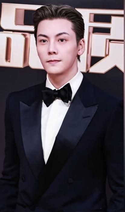 他选择一套剪裁精准的黑色修身西装,细节处暗藏巧思:领口一枚小巧蝴蝶结点缀其间,精致却不甜腻,复古又不失现代气息。